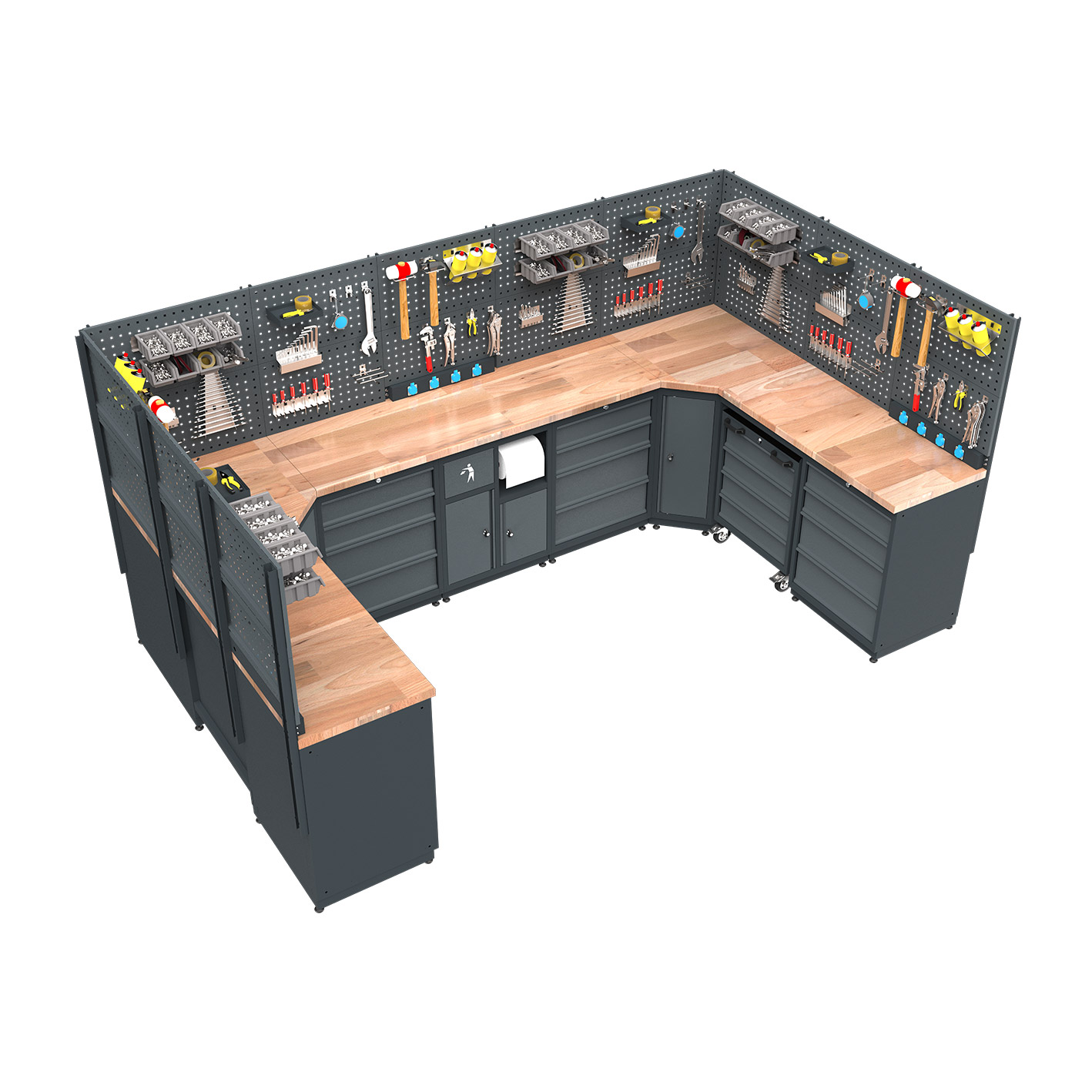 Çalışma Tablası; 2 adet 550x1240mm, 2 adet 750X750mm ve 3 adet 550x1860mm ölçülerinde 30mm masif kayın panelden üretilmiş olup paslanmaz çelik tabla alternatifi mevcuttur.